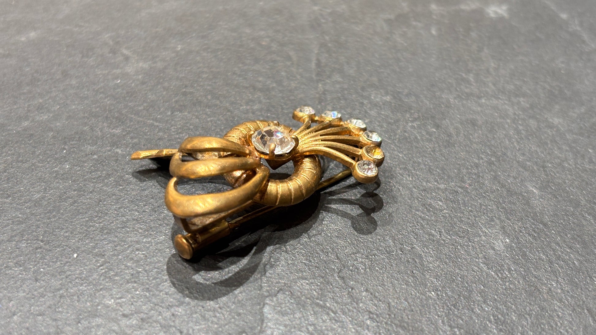Plongez dans l’élégance des années 1940 avec cette broche vintage ancienne à strass, une pièce rare plaquée or agrémentée de strass scintillants typiques du style rétro-glamour de l’époque. Véritable bijou d’antan, cette broche ancienne ajoute une touche sophistiquée et féminine à vos vestes et tenues de soirée.