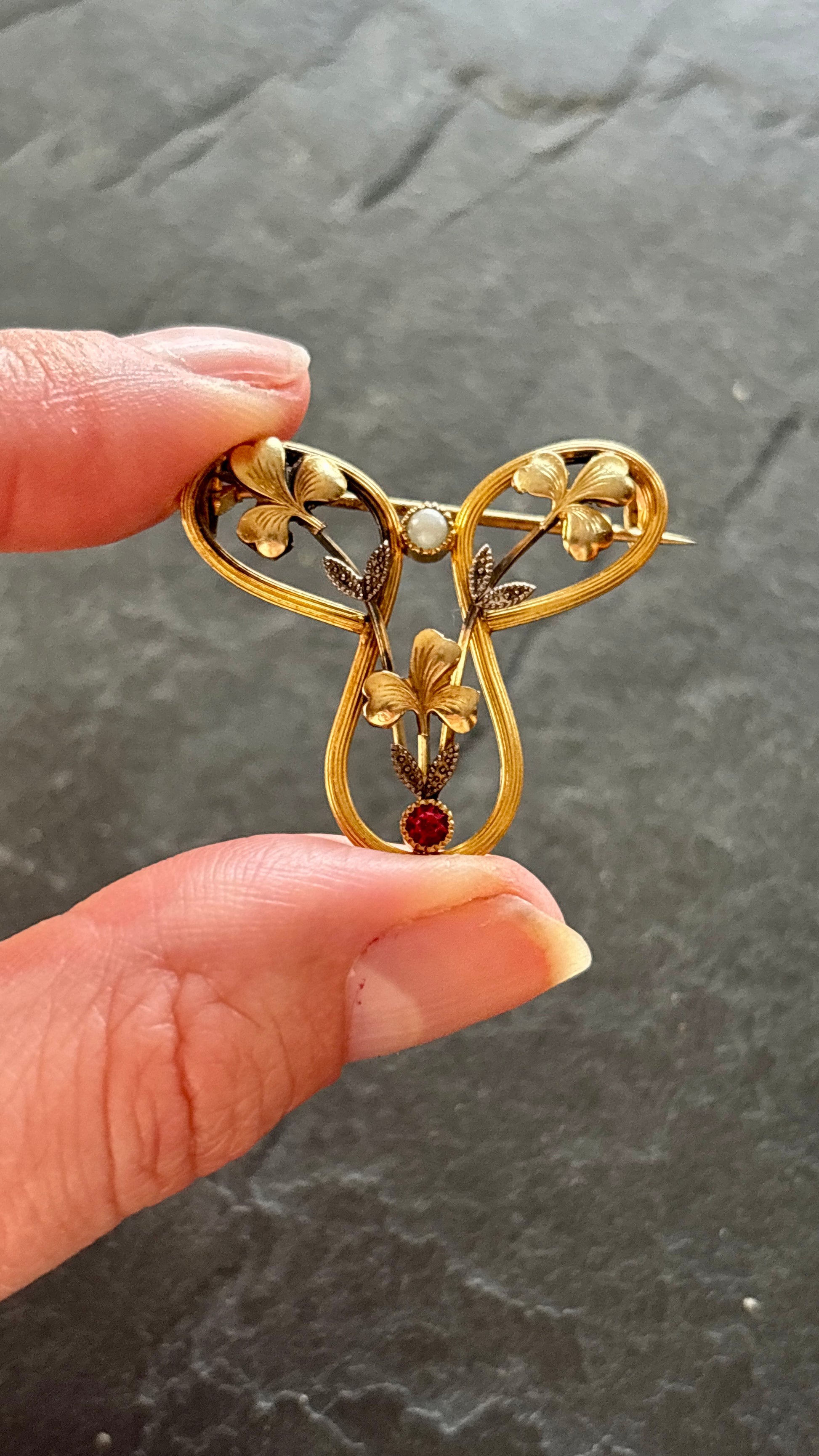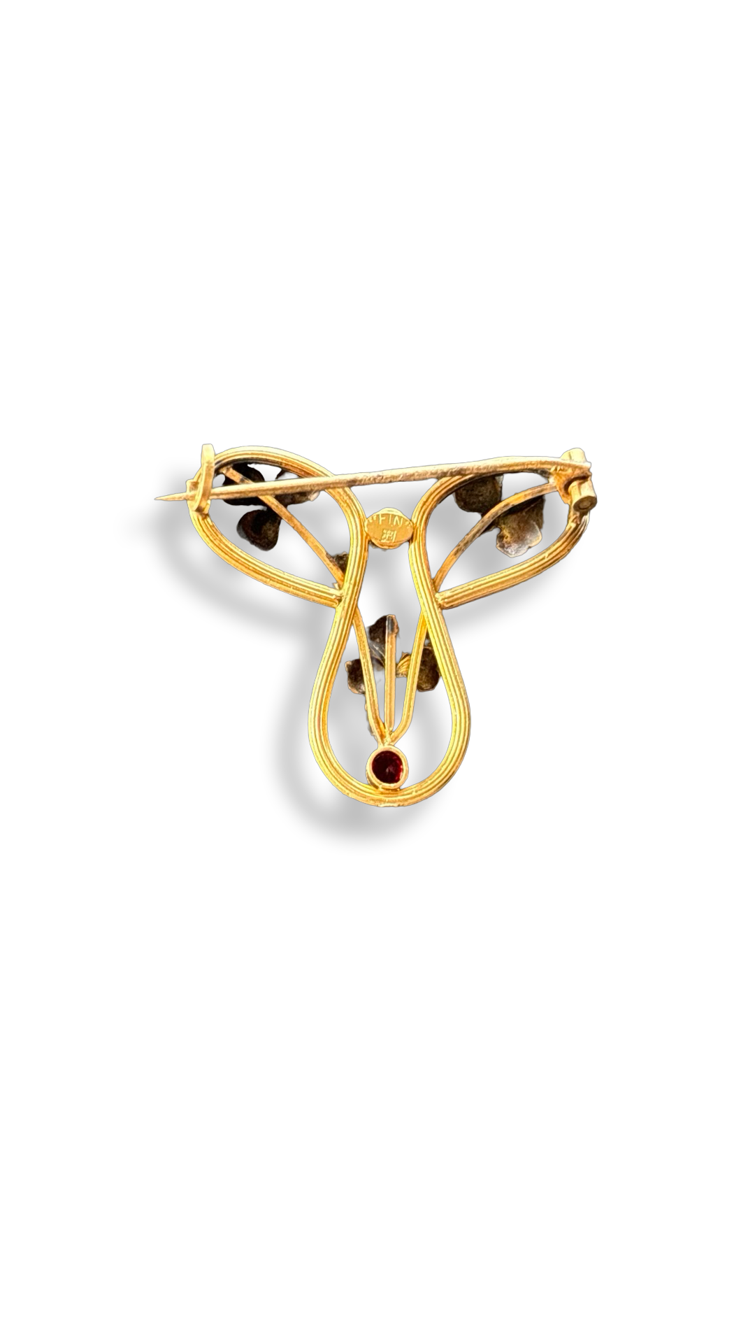 Broche Art Nouveau ancienne, en FIX finement travaillé avec un motif floral organique.petite perle et strass de couleurs rouge.