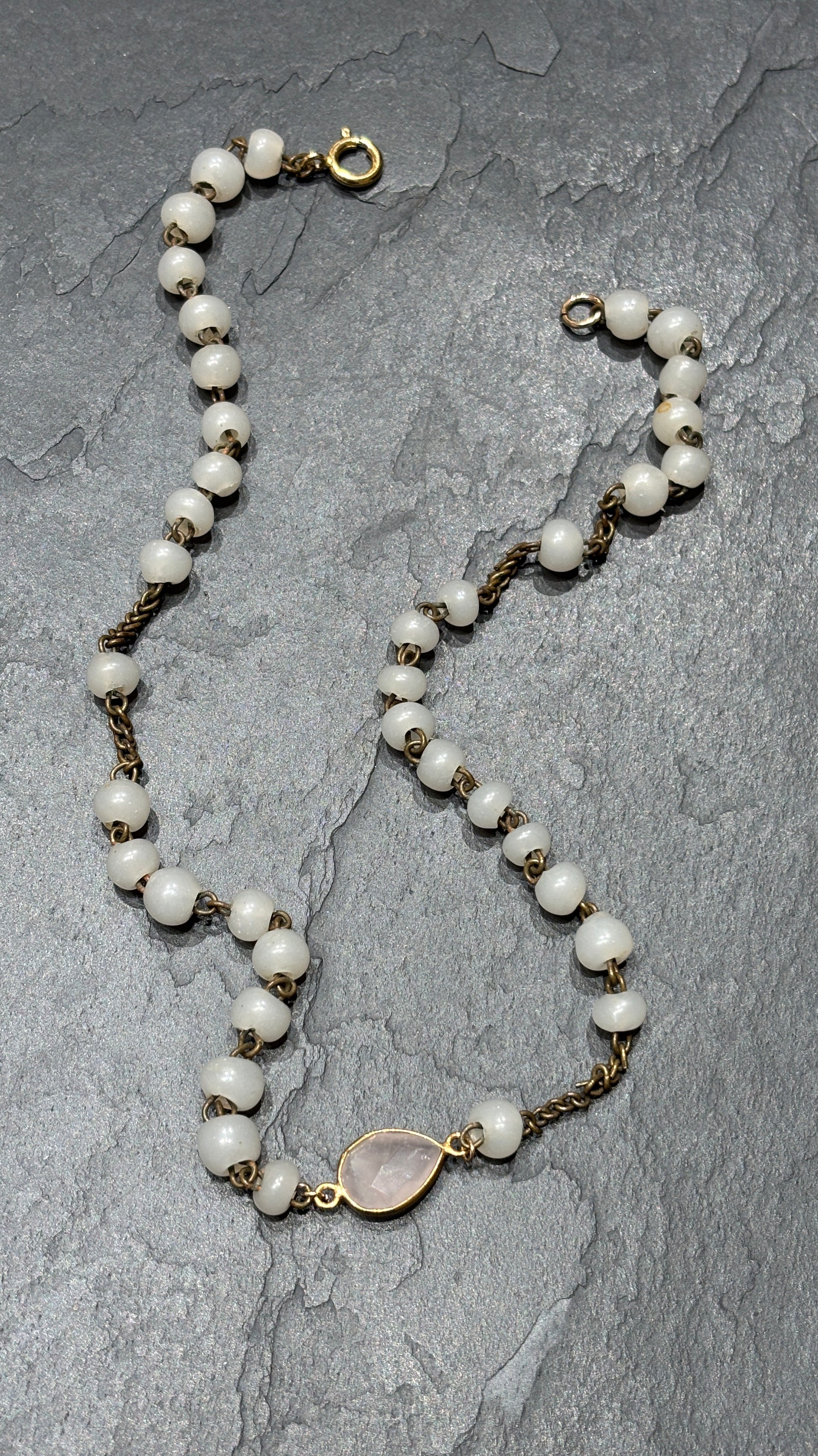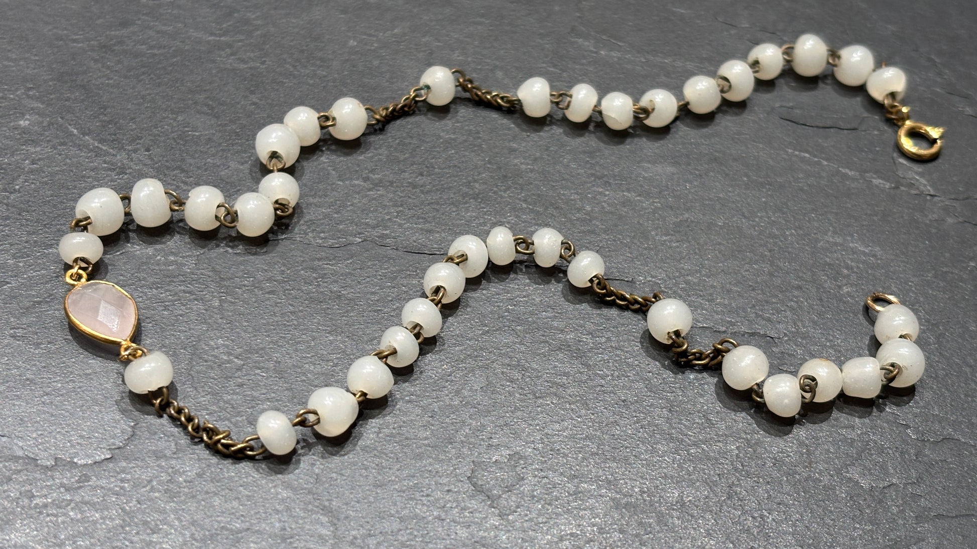 Le collier chapelet blanc et goutte en quartz rose est une création délicate qui mêle pureté et douceur. Les perles blanches lumineuses contrastent harmonieusement avec la goutte de quartz rose, symbole d’amour et de sérénité. Chaque composant est issu d’un chapelet ancien chiné et transformé à la main à Paris pour une esthétique raffinée et significative.