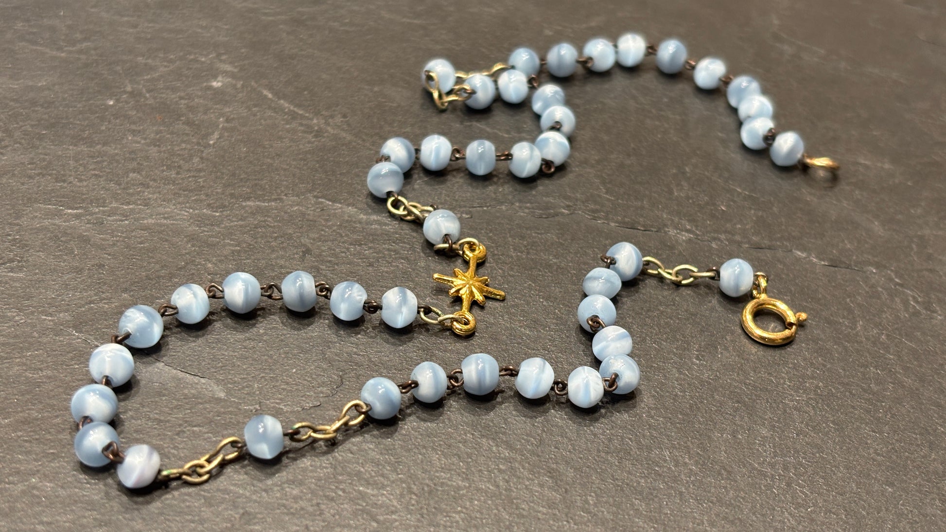 Craquez pour le collier chapelet bleu pale et étoile plaquée or, une pièce délicate et originale upcyclée à la main à Paris. Les perles bleu pâle captent la lumière avec élégance, tandis que l’étoile plaquée or ajoute une touche subtile de sophistication. Revalorisant un chapelet ancien chiné, ce bijou unique mêle charme vintage et modernité dans un design chic et facile à porter.