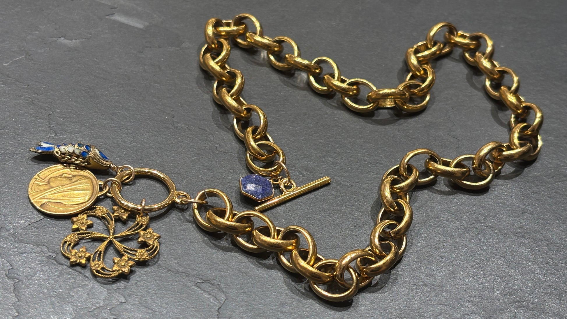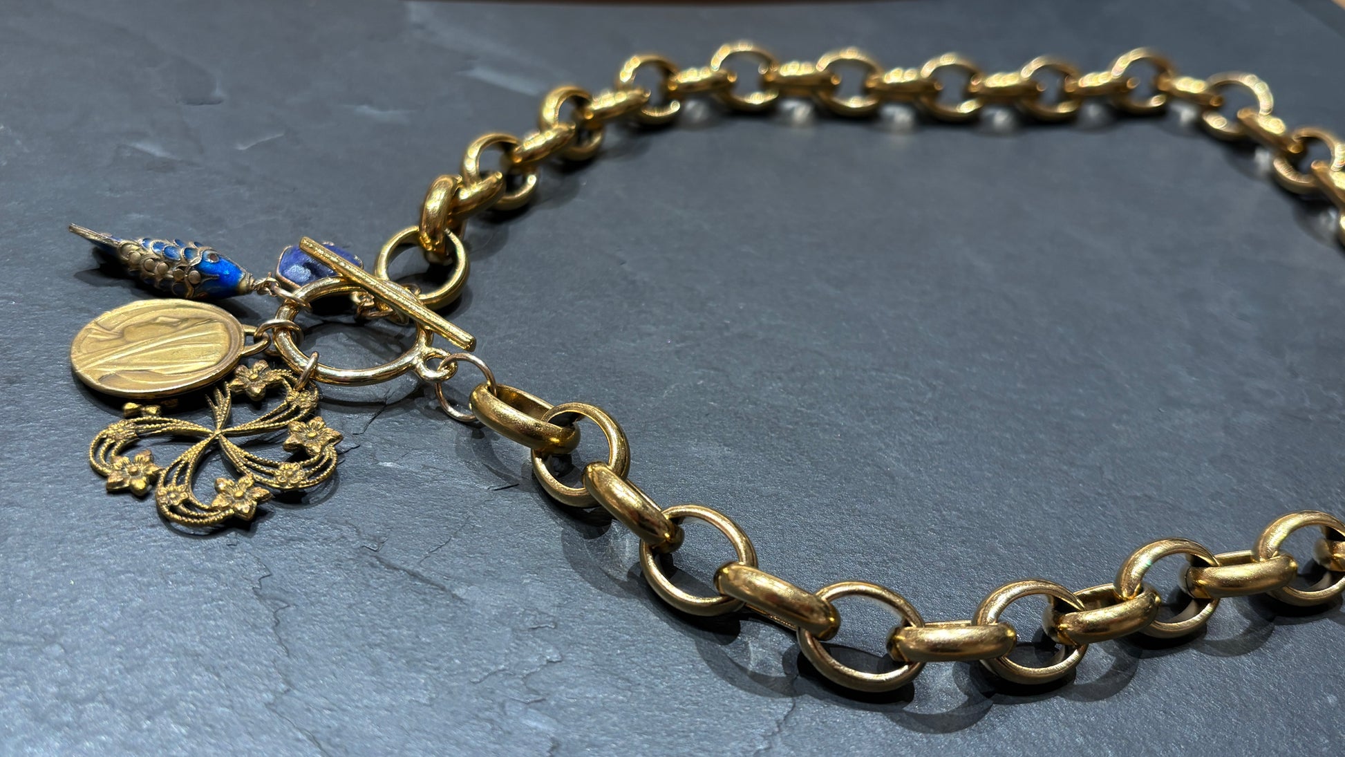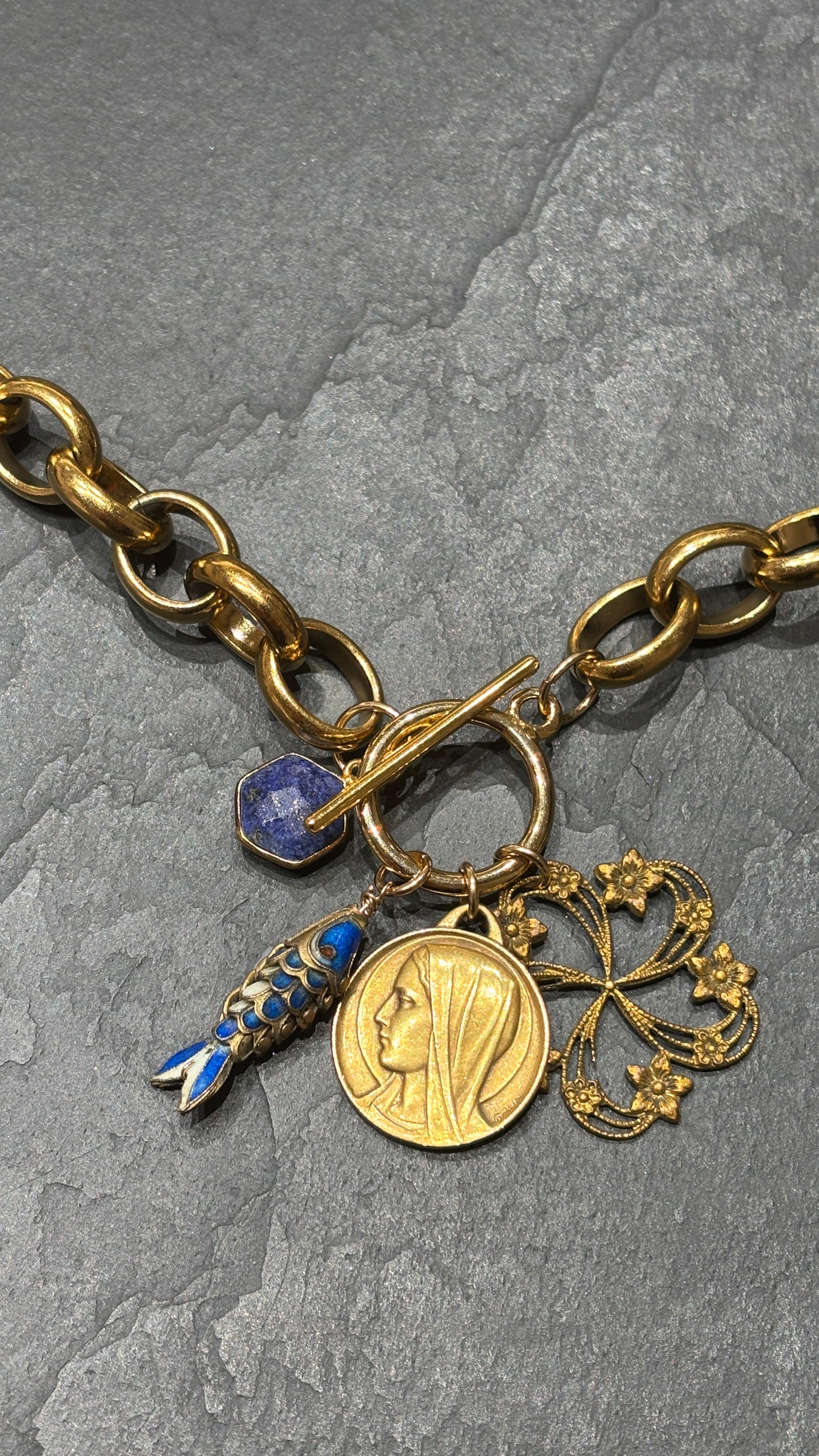 Collier composé à partir d’une marge chaîne à maille en acier inox doré chinée, associée à une médaille ancienne de la Vierge au Voile plaquée or, un poisson chinois ancien, émaillé et articulé, un élément décoratif en dentelle métallique doré ancien et un Lapis Lazuli serti sur plaqué or.