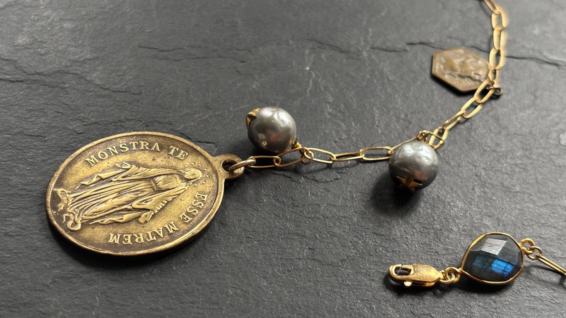 Collier imaginé à partir d'une chaine goldfilled à maille rectangle , associée à un large pendentif de la Congrégation des Enfants de Marie, avec une Vierge en majesté, fin XIXe siècle, deux perles fantaisie grises provenant de boutons de manchettes anciens , une médaille ancienne de Saint Christophe et une goutte en labradorite sertie sur plaqué or.