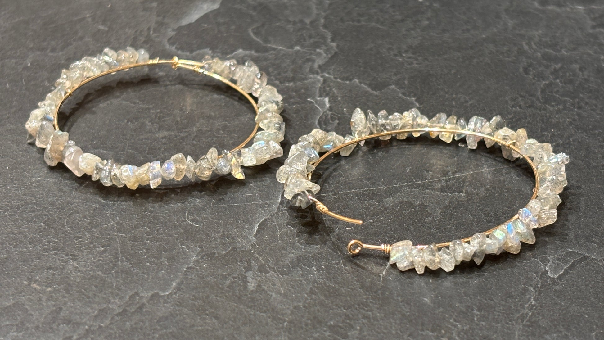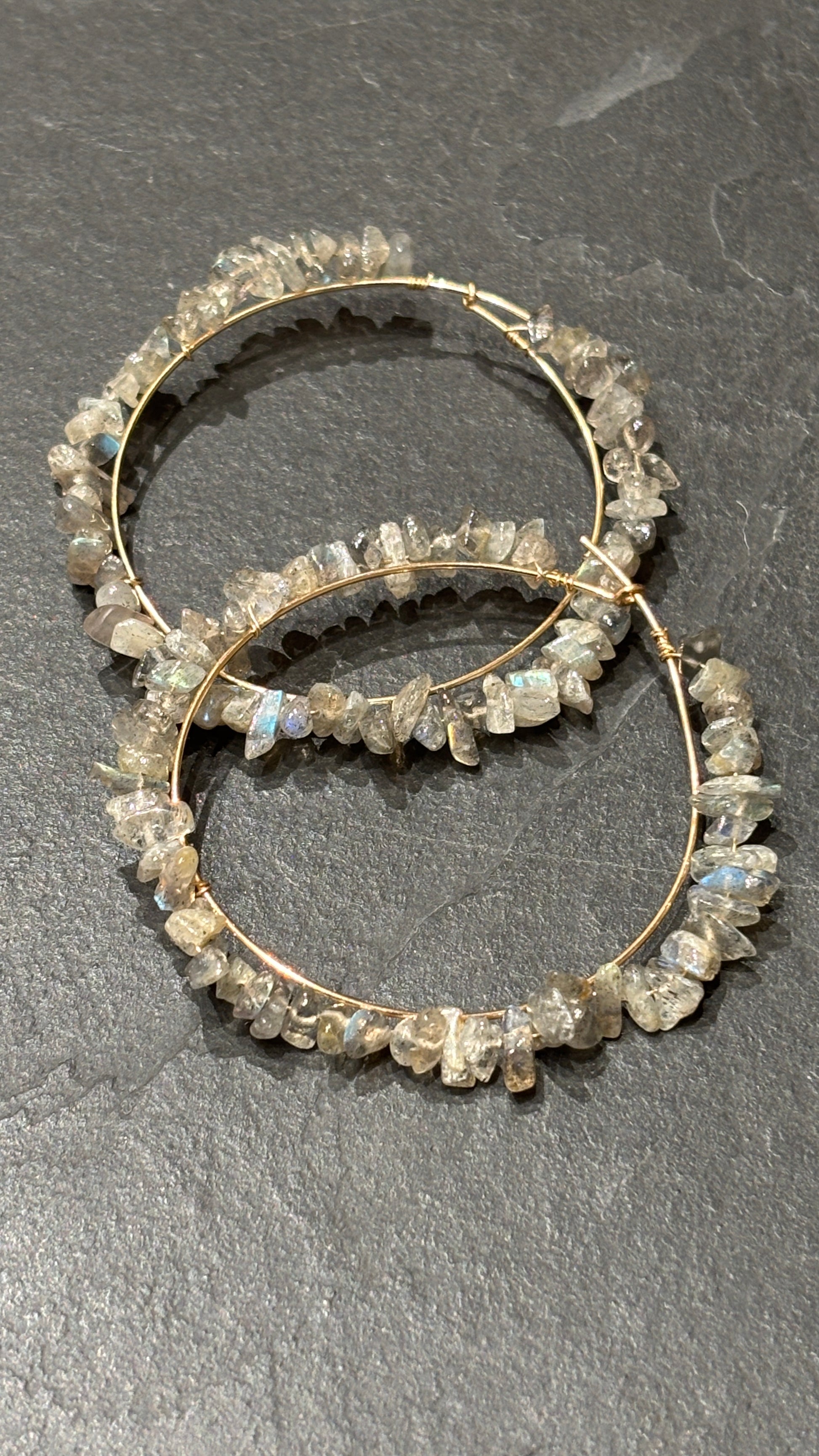 Larges créoles fines en goldfilled , ornée d’une ligne d’éclats de Labradorite chinés.