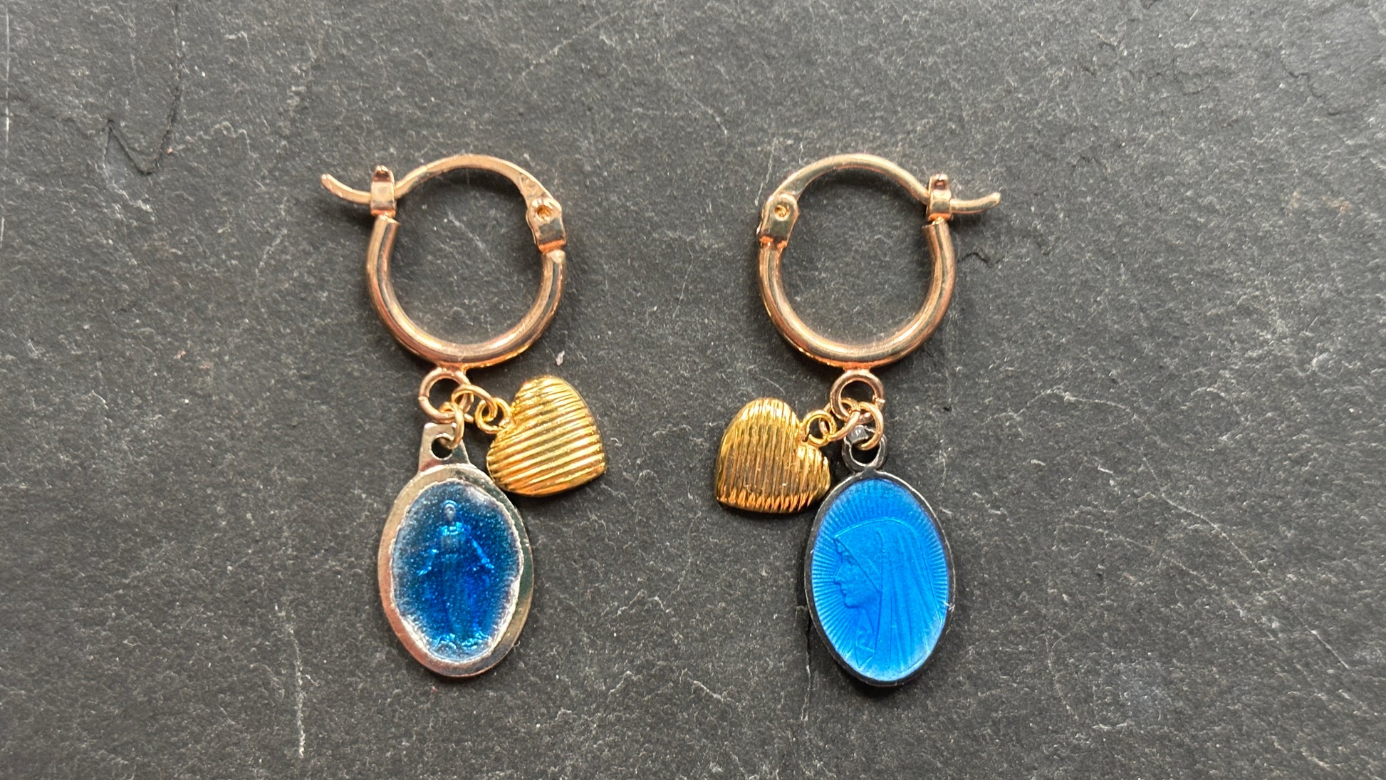Paire de mini créoles en goldfilled a fermeture dormeuses, ornées de cœurs striés plaqués or et de petites émaillées anciennes, l’un provenant de Lourdes, la seconde la chapelle de la Médaille Miraculeuse.