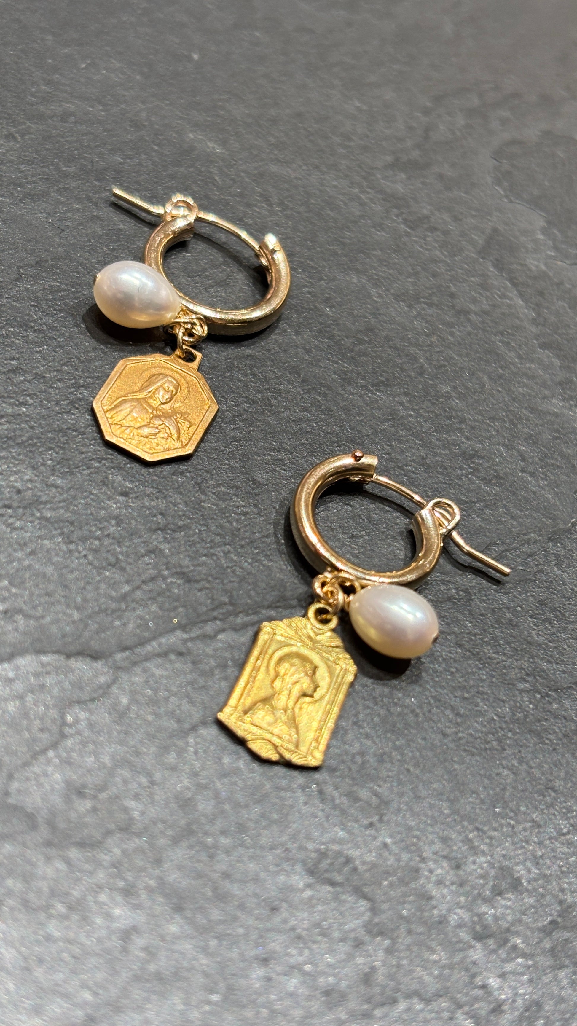 Boucles d’oreilles upcyclées combinant créoles délicates, perles fines et médailles saintes d’époque, façonnées à la main à Paris. Ces mini-créoles incarnent l’intemporalité et l’authenticité, ajoutant à votre tenue une touche de spiritualité et de raffinement vintage.