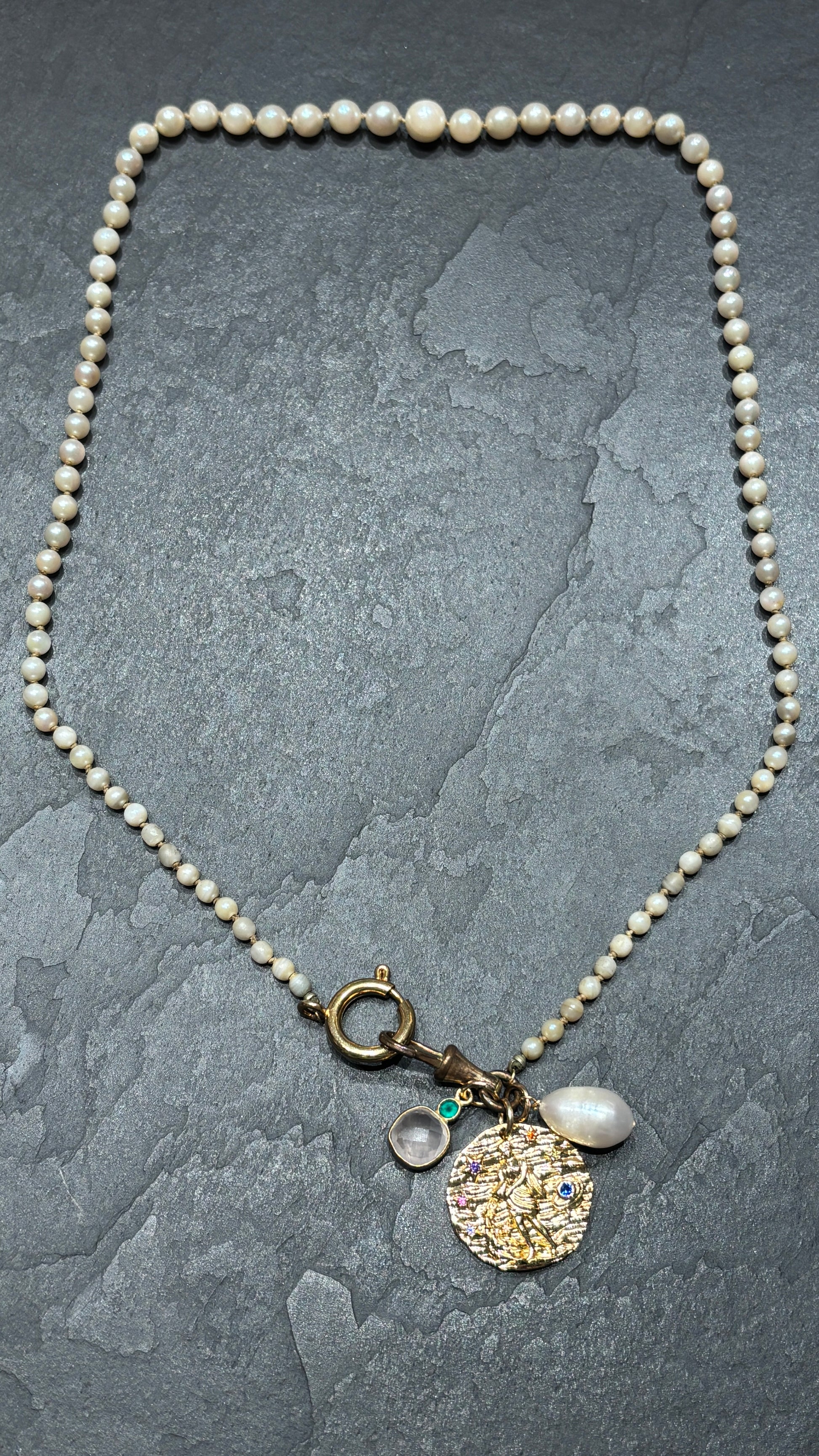 VERSAU. Collier de perles ancien, quartz rose et zodiaque